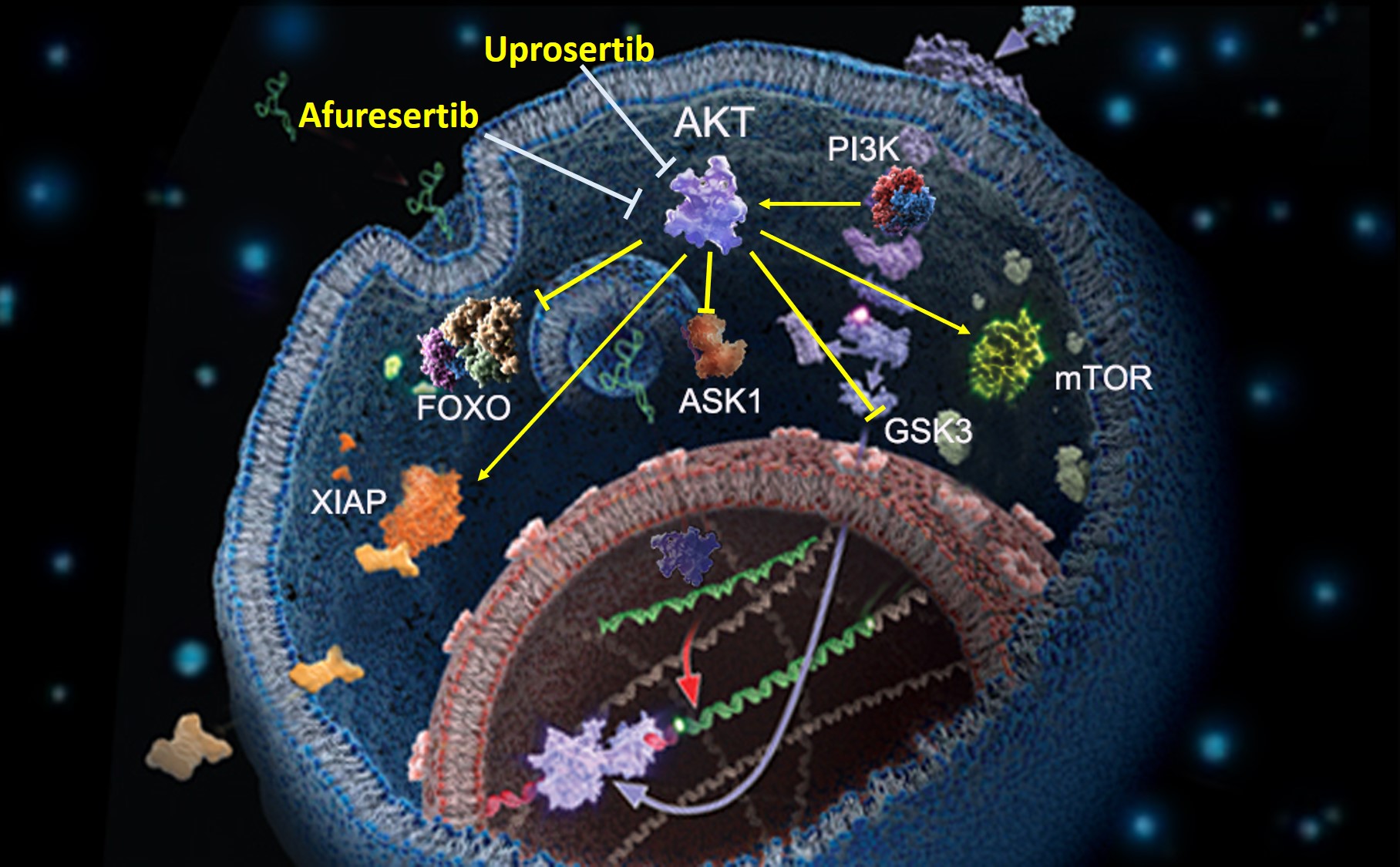 这两款候选药物为口服泛Akt激酶抑制剂,分别为afuresertib (ASB183)和uprosertib (UPB795)。这两款候选药物的10多项临床1/2期研究已在多种癌症适应症中进行,包括卵巢癌、胃癌、多发性骨髓瘤、黑色素瘤等。这些试验表明,候选药物在癌症患者的临床疗效和耐受安全性方面取得了积极的结果。